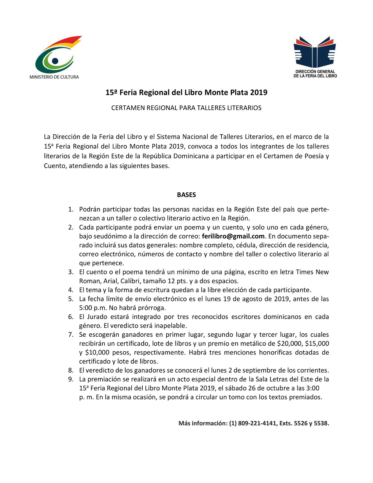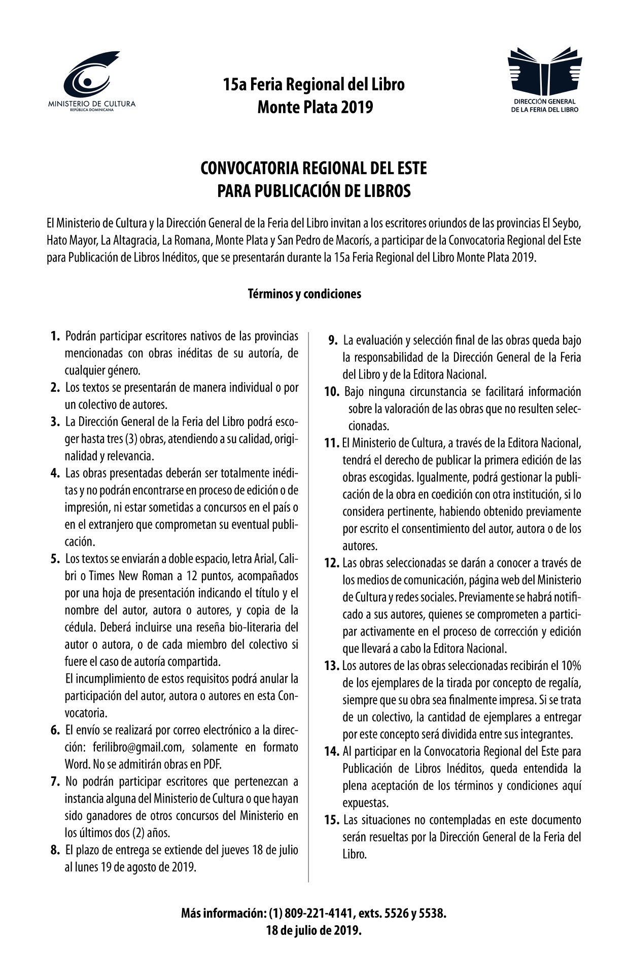 El ministerio de Cultura y la Dirección General de la Feria del Libro invitan a los escritores orieundos de las provincias El Seybo, Hato Mayor, La Altagracia, La Romana, Monte Plata y San Pedro de Macorís, a participar de la Convocatoria Regional del Este para Publicación de Libros Inéditos, que se presentarán durante la 15a Feria Regional del Libro Monte Plata 2019.