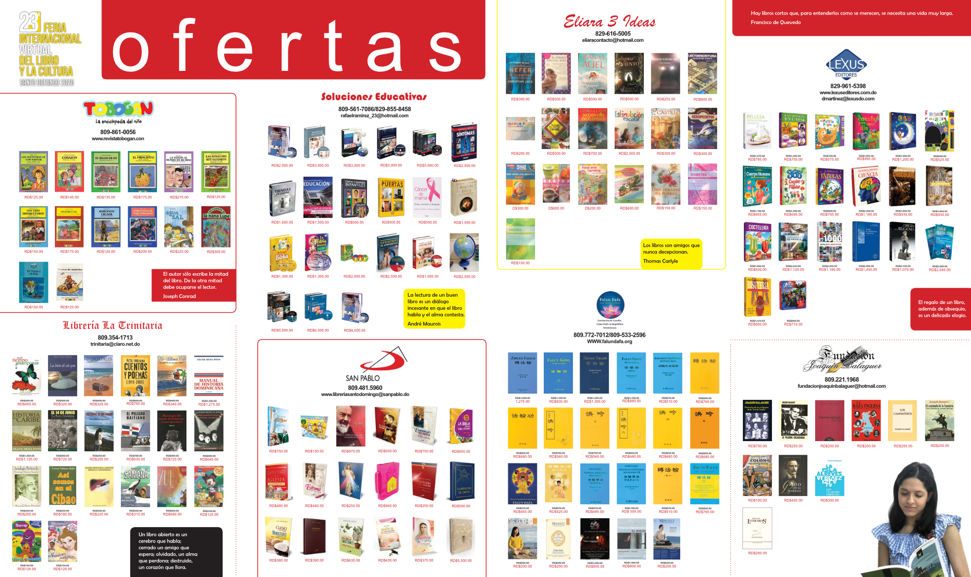 Los establecimientos participantes son Soluciones Educativas, Lexus Editores, Eliara 3 Ideas, La Trinitaria, Librería San Pablo, Tobogán y Asociación Falum Dafa. A la oferta se suma la Fundación Joaquín Balaguer. Las librerías están en la Feria Virtual.