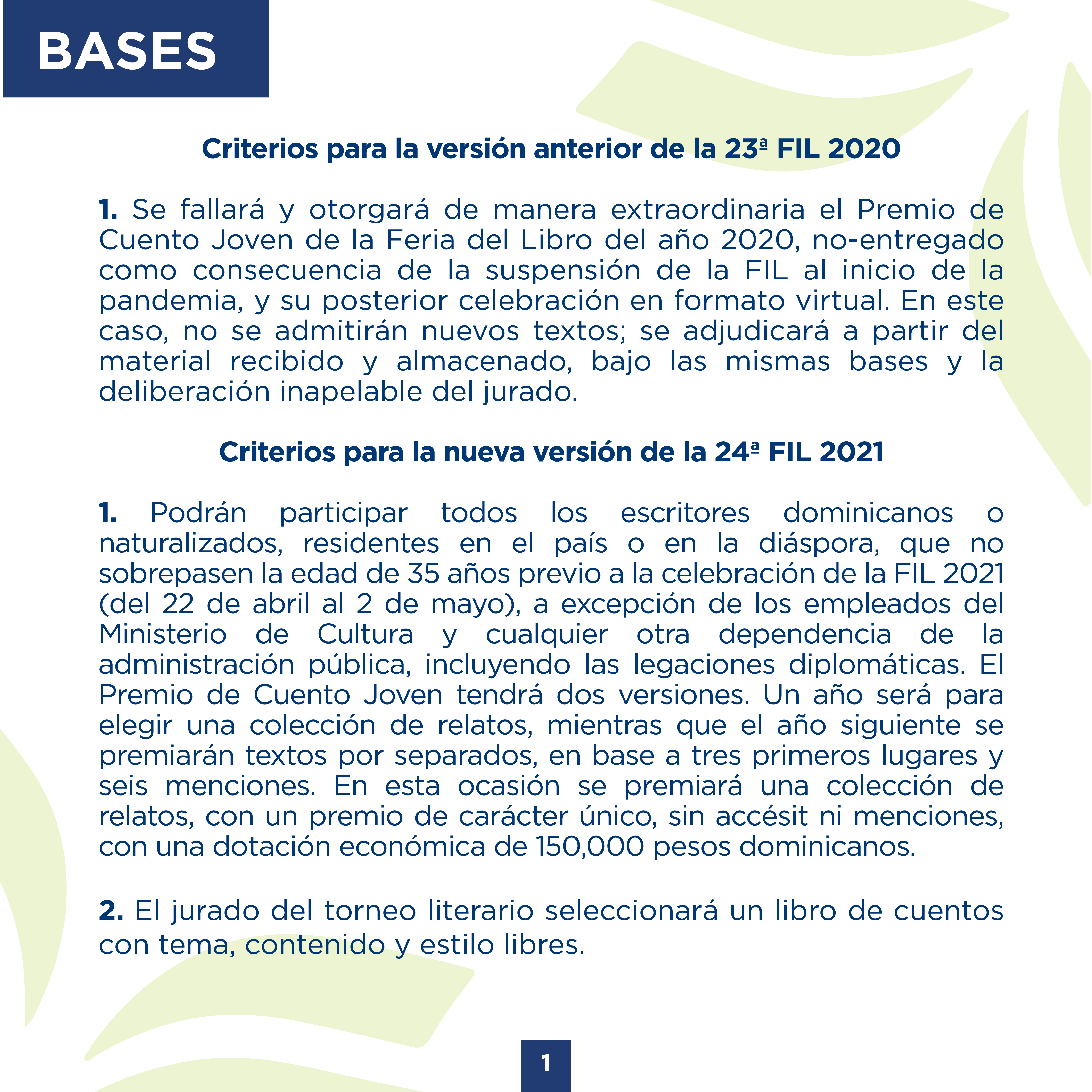 Podrán participar todos los escritores dominicanos o naturalizados, residentes en el país o en la diáspora, que no sobrepasen la edad de 35 años previo a la celebración de la FIL 2021 (del 22 de abril al 2 de mayo), a excepción de los empleados del Ministerio de Cultura y cualquier otra dependencia de la administración pública, incluyendo las legaciones diplomáticas.