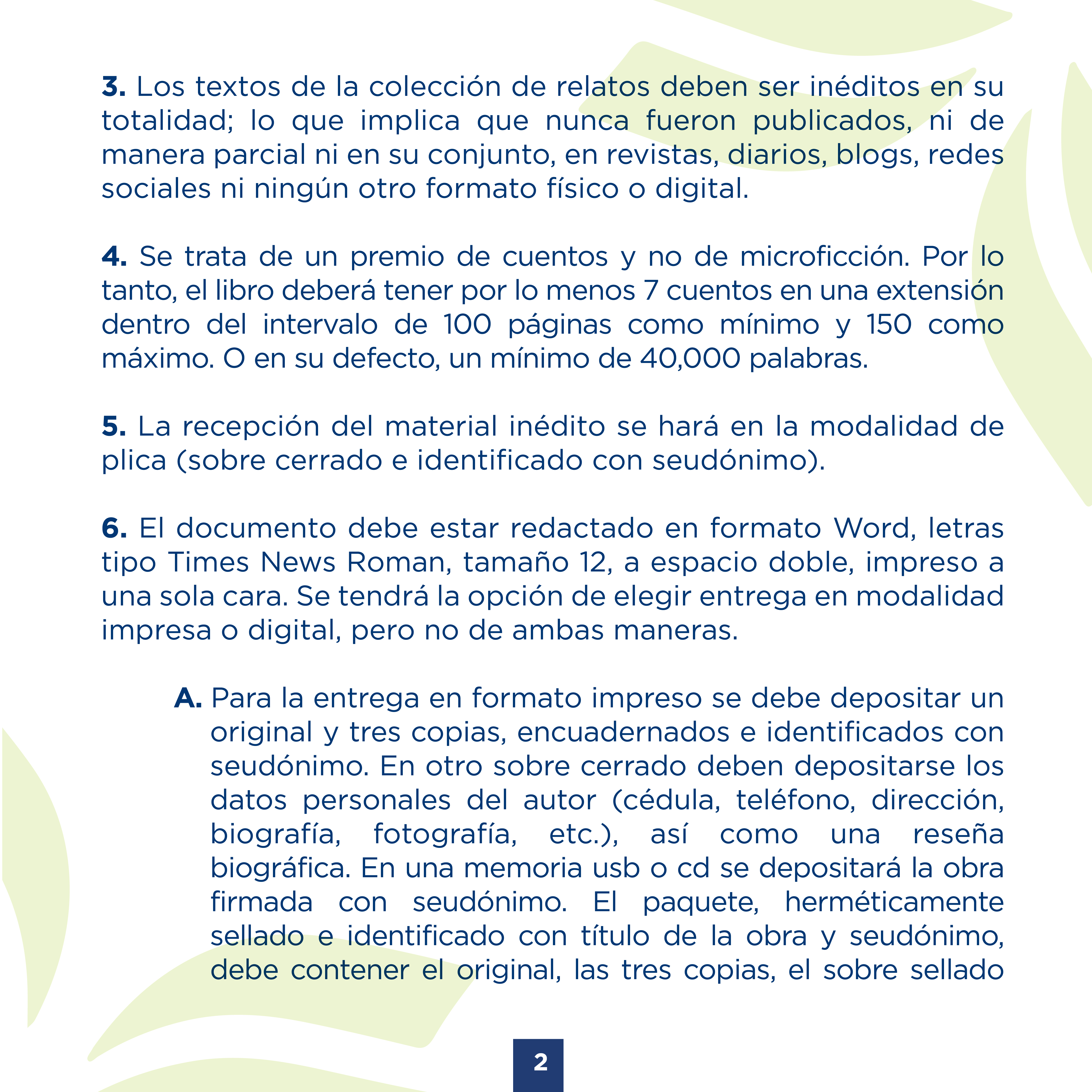 A. Para la entrega en formato impreso se debe depositar un original y tres copias, encuadernados e identificados con seudónimo. En otro sobre cerrado deben depositarse los datos personales del autor (cédula, teléfono, dirección, biografía, fotografía, etc.), así como una reseña biográfica. En una memoria usb o cd se depositará la obra firmada con seudónimo. El paquete, herméticamente sellado e identificado con título de la obra y seudónimo, debe contener el original, las tres copias, el sobre sellado con los datos personales y la memoria o cd. La entrega debe hacerse de lunes a viernes en la ubicación siguiente: