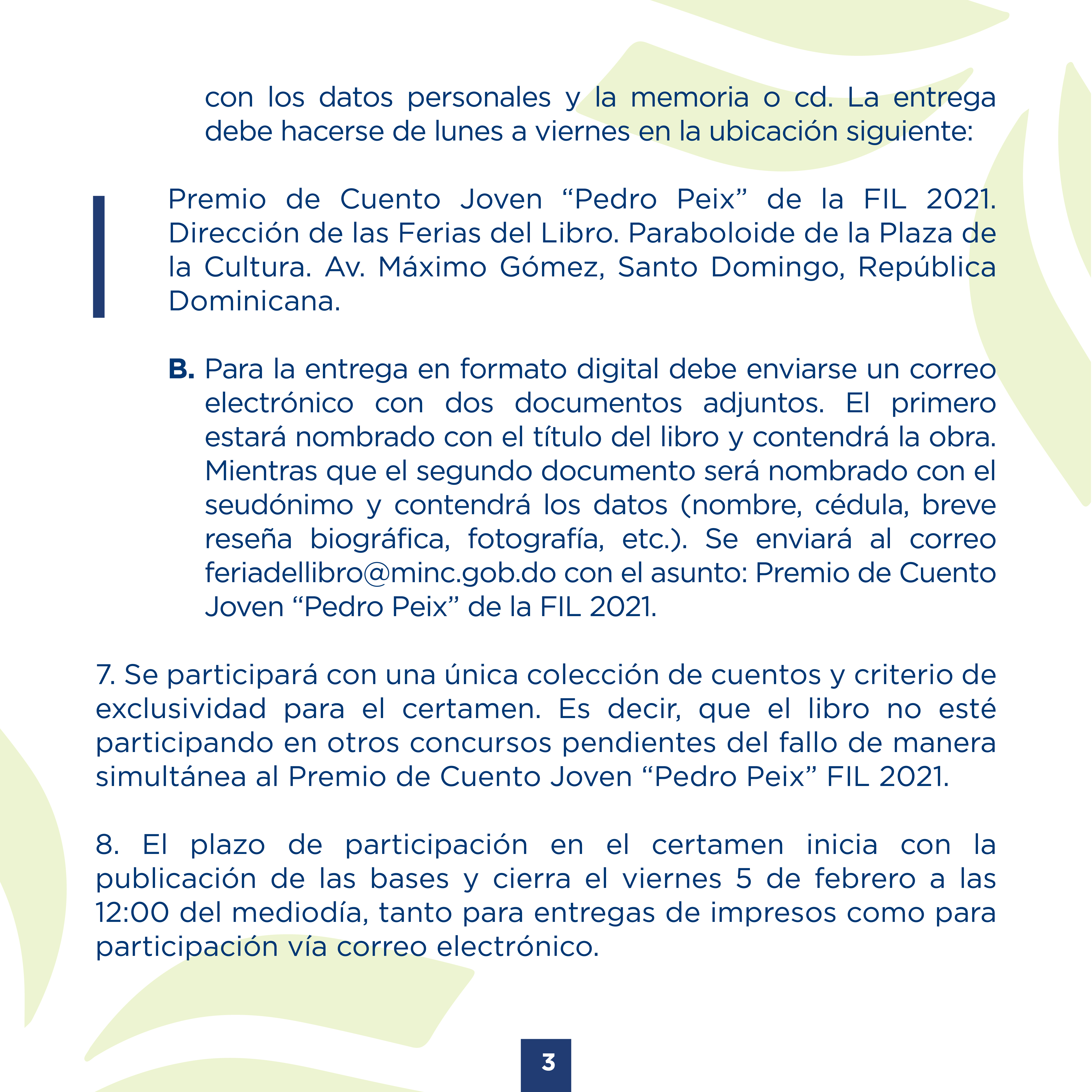 B. Para la entrega en formato digital debe enviarse un correo electrónico con dos documentos adjuntos. El primero estará nombrado con el título del libro y contendrá la obra. Mientras que el segundo documento será nombrado con el seudónimo y contendrá los datos (nombre, cédula, breve reseña biográfica, fotografía, etc.). Se enviará al correo Esta dirección de correo electrónico está siendo protegida contra los robots de spam. Necesita tener JavaScript habilitado para poder verlo. con el asunto: Premio de Cuento Joven “Pedro Peix” de la FIL 2021.