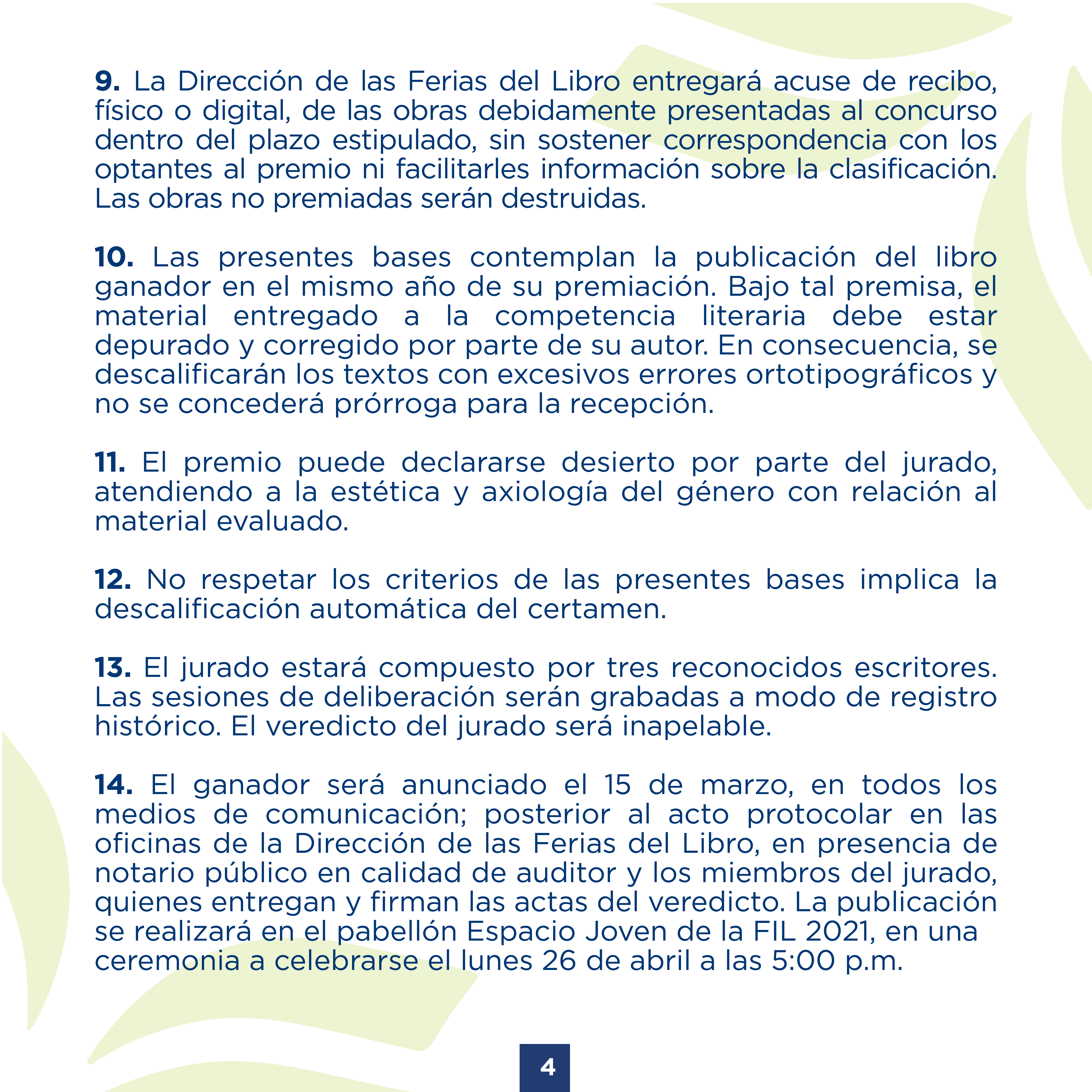 El ganador será anunciado el 15 de marzo, en todos los medios de comunicación; posterior al acto protocolar en las oficinas de la Dirección de las Ferias del Libro, en presencia de notario público en calidad de auditor y los miembros del jurado, quienes entregan y firman las actas del veredicto. La publicación se realizará en el pabellón Espacio Joven de la FIL 2021, en una ceremonia a celebrarse el lunes 26 de abril a las 5:00 p.m.