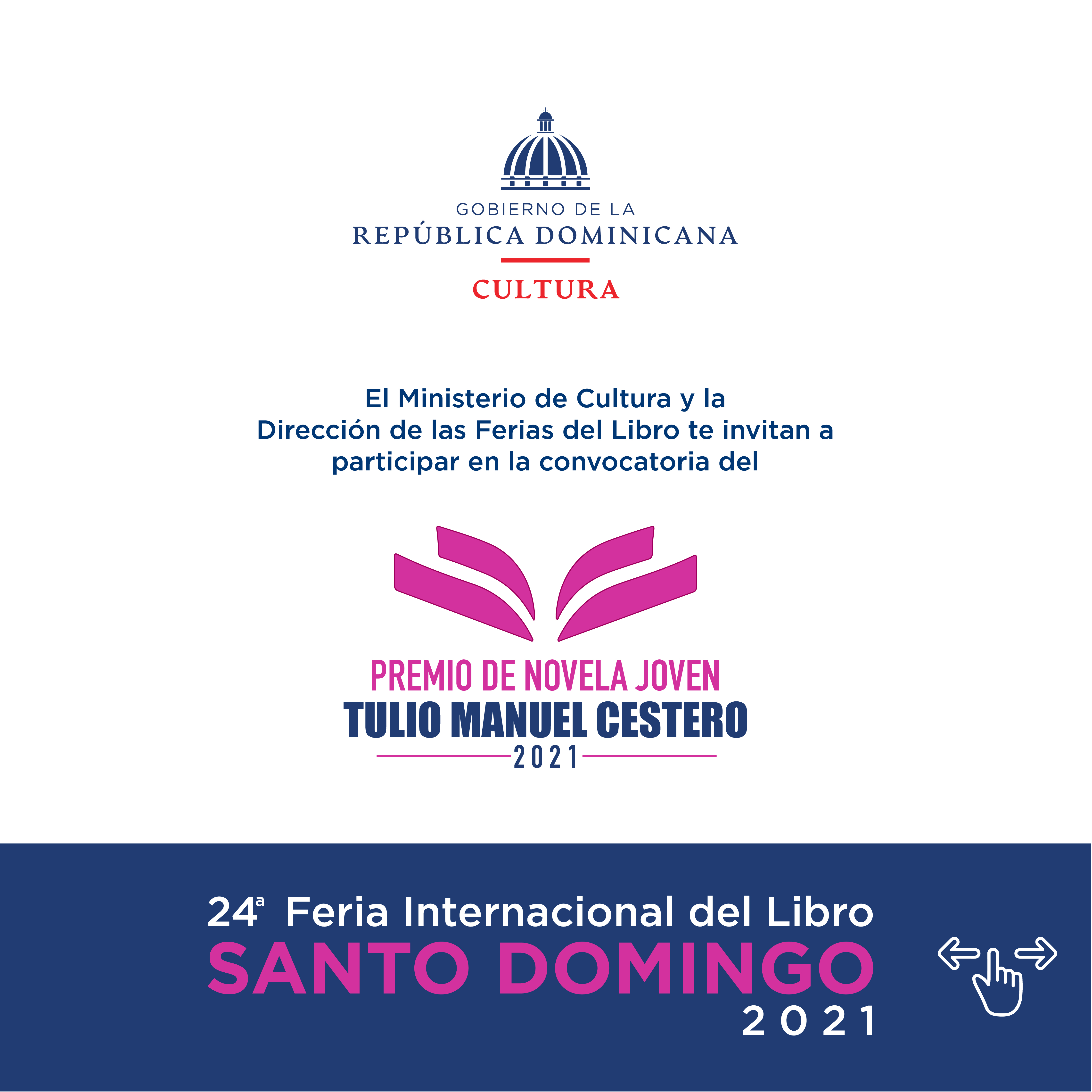 El Ministerio de Cultura y la Dirección de las Ferias del Libro convocan al Premio de Novela Joven “Tulio Manuel Cestero” de la 24ª edición de la Feria Internacional del Libro 2021, a celebrarse del 22 de abril al 2 de mayo, dedicada en homenaje a los escritores Pedro Peix y Carmen Natalia.