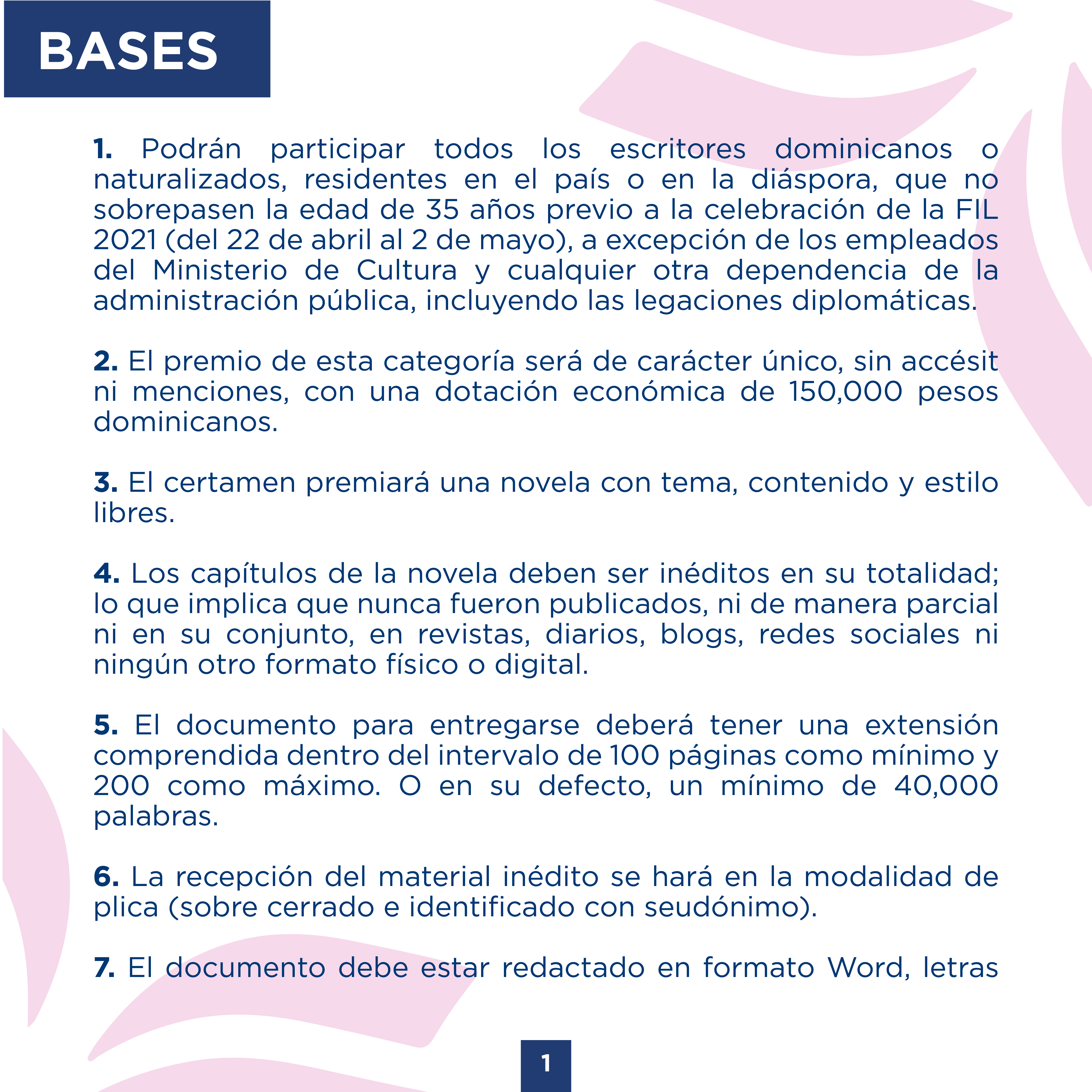 Podrán participar todos los escritores dominicanos o naturalizados, residentes en el país o en la diáspora, que no sobrepasen la edad de 35 años previo a la celebración de la FIL 2021 (del 22 de abril al 2 de mayo), a excepción de los empleados del Ministerio de Cultura y cualquier otra dependencia de la administración pública, incluyendo las legaciones diplomáticas.