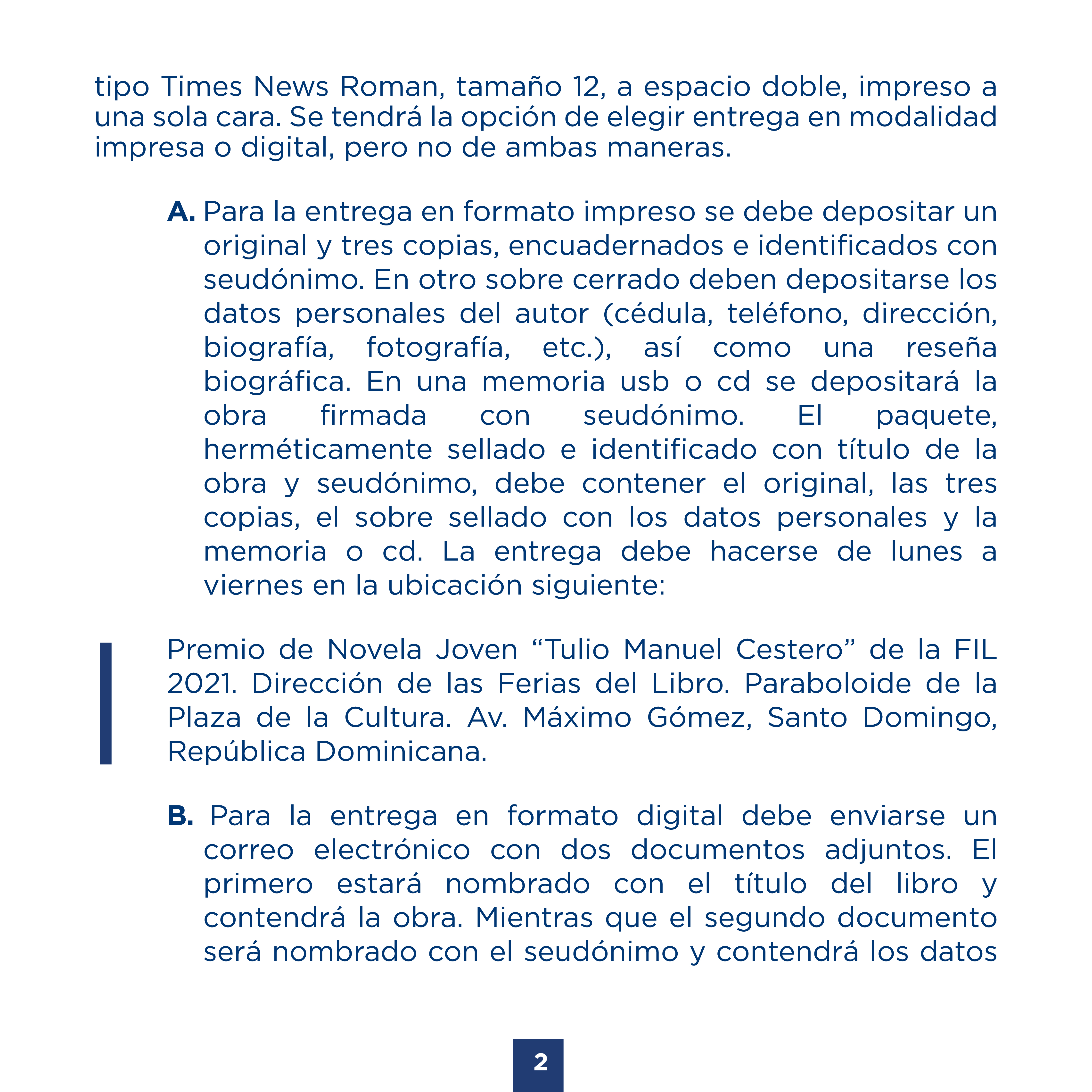 B. Para la entrega en formato digital debe enviarse un correo electrónico con dos documentos adjuntos. El primero estará nombrado con el título del libro y contendrá la obra. Mientras que el segundo documento será nombrado con el seudónimo y contendrá los datos (nombre, cédula, breve reseña biográfica, fotografía, etc.). Se enviará al correo Esta dirección de correo electrónico está siendo protegida contra los robots de spam. Necesita tener JavaScript habilitado para poder verlo. con el asunto: Premio de Novela Joven “Tulio Manuel Cestero” de la FIL 2021.