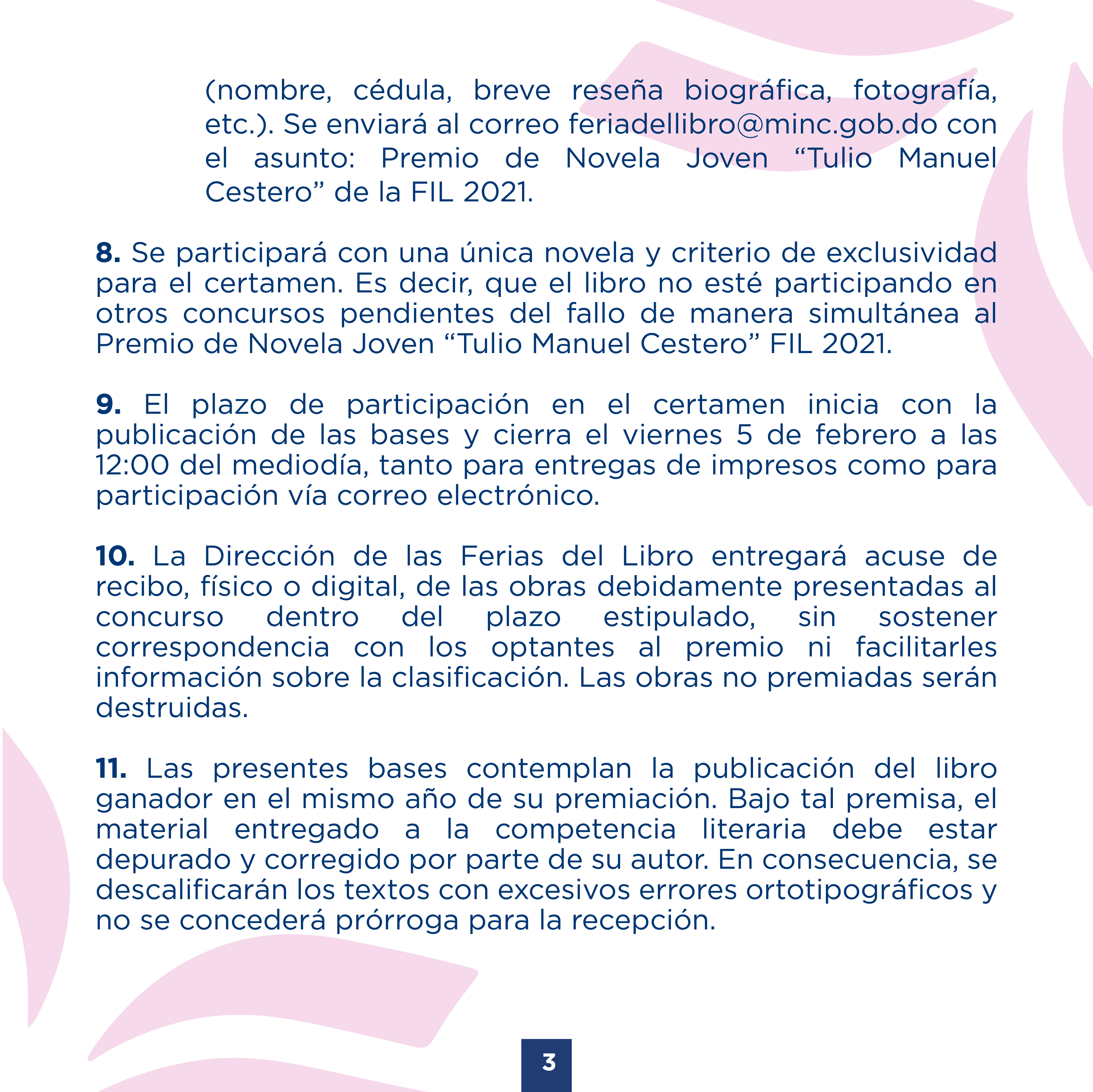Se participará con una única novela y criterio de exclusividad para el certamen. Es decir, que el libro no esté participando en otros concursos pendientes del fallo de manera simultánea al Premio de Novela Joven “Tulio Manuel Cestero” FIL 2021.