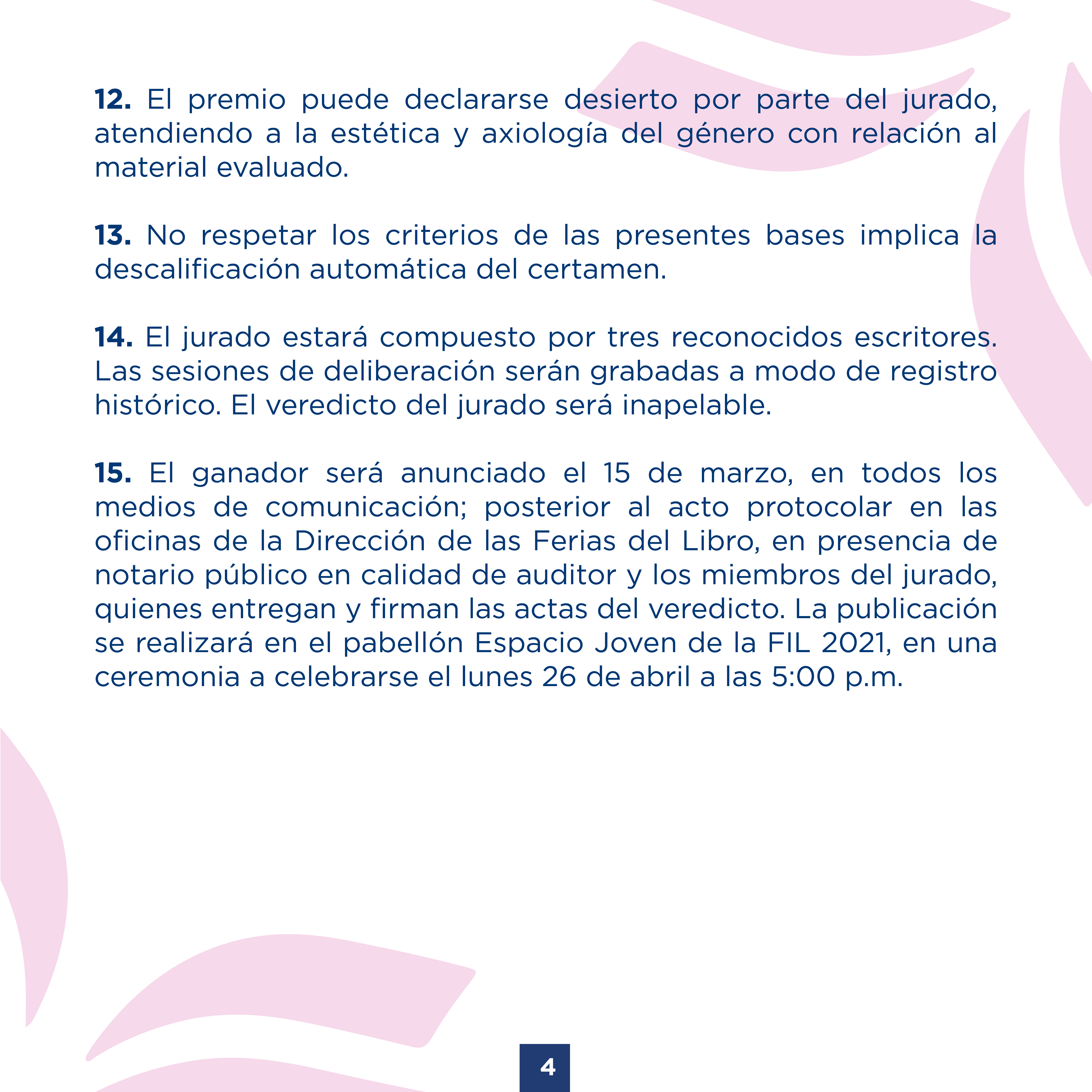 El ganador será anunciado el 15 de marzo, en todos los medios de comunicación; posterior al acto protocolar en las oficinas de la Dirección de las Ferias del Libro, en presencia de notario público en calidad de auditor y los miembros del jurado, quienes entregan y firman las actas del veredicto. La publicación se realizará en el pabellón Espacio Joven de la FIL 2021, en una ceremonia a celebrarse el lunes 26 de abril a las 5:00 p.m.