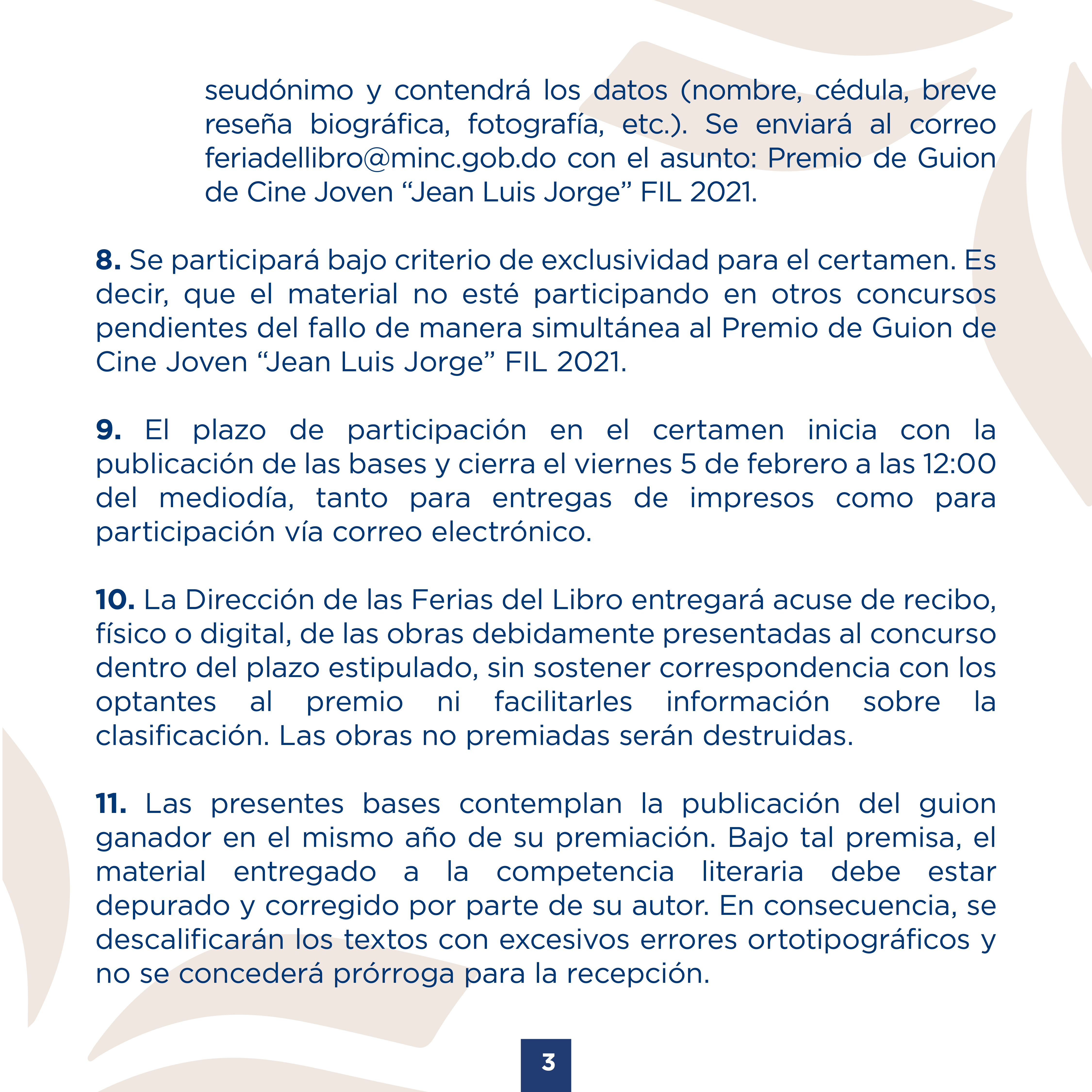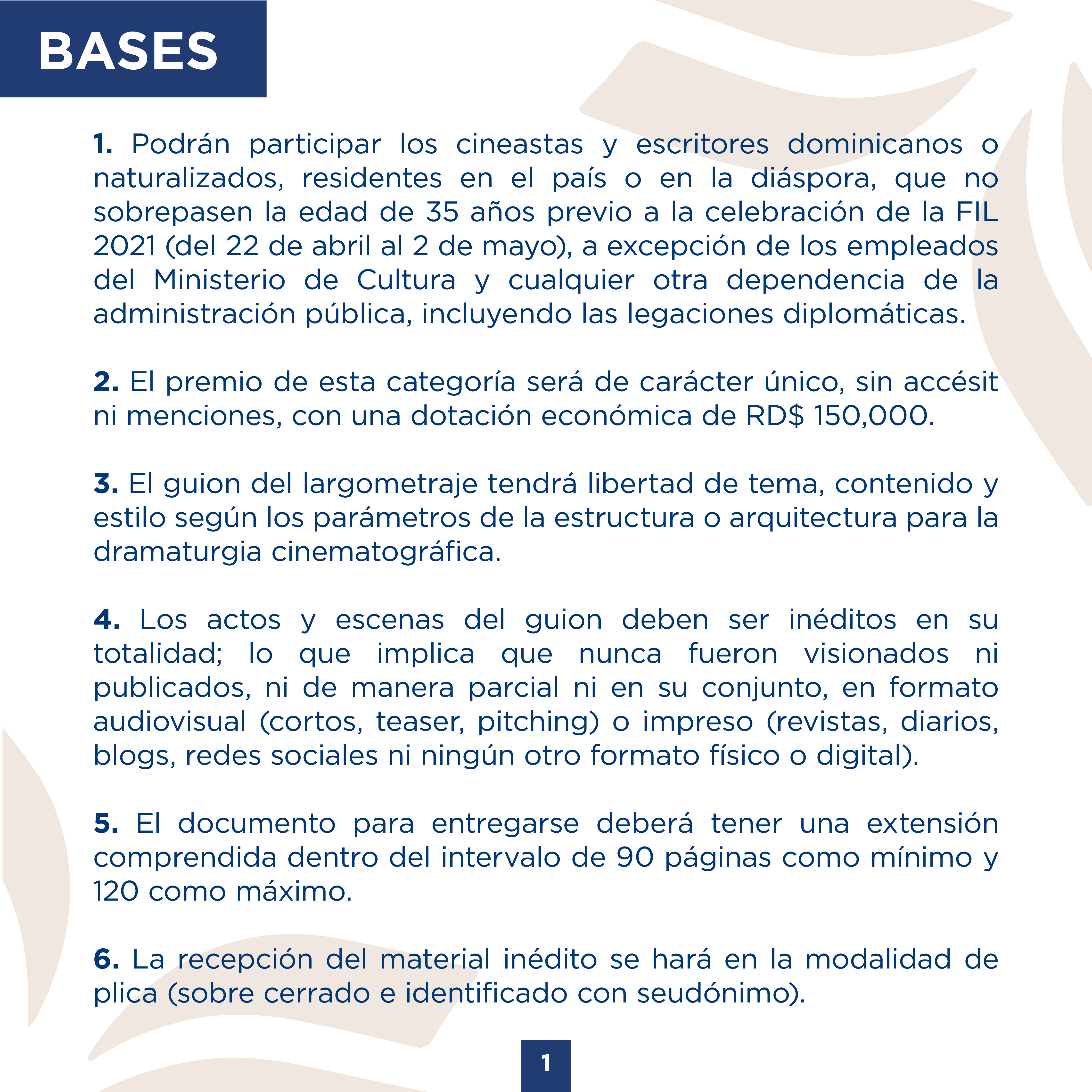 Podrán participar los cineastas y escritores dominicanos o naturalizados, residentes en el país o en la diáspora, que no sobrepasen la edad de 35 años previo a la celebración de la FIL 2021 (del 22 de abril al 2 de mayo), a excepción de los empleados del Ministerio de Cultura y cualquier otra dependencia de la administración pública, incluyendo las legaciones diplomáticas.