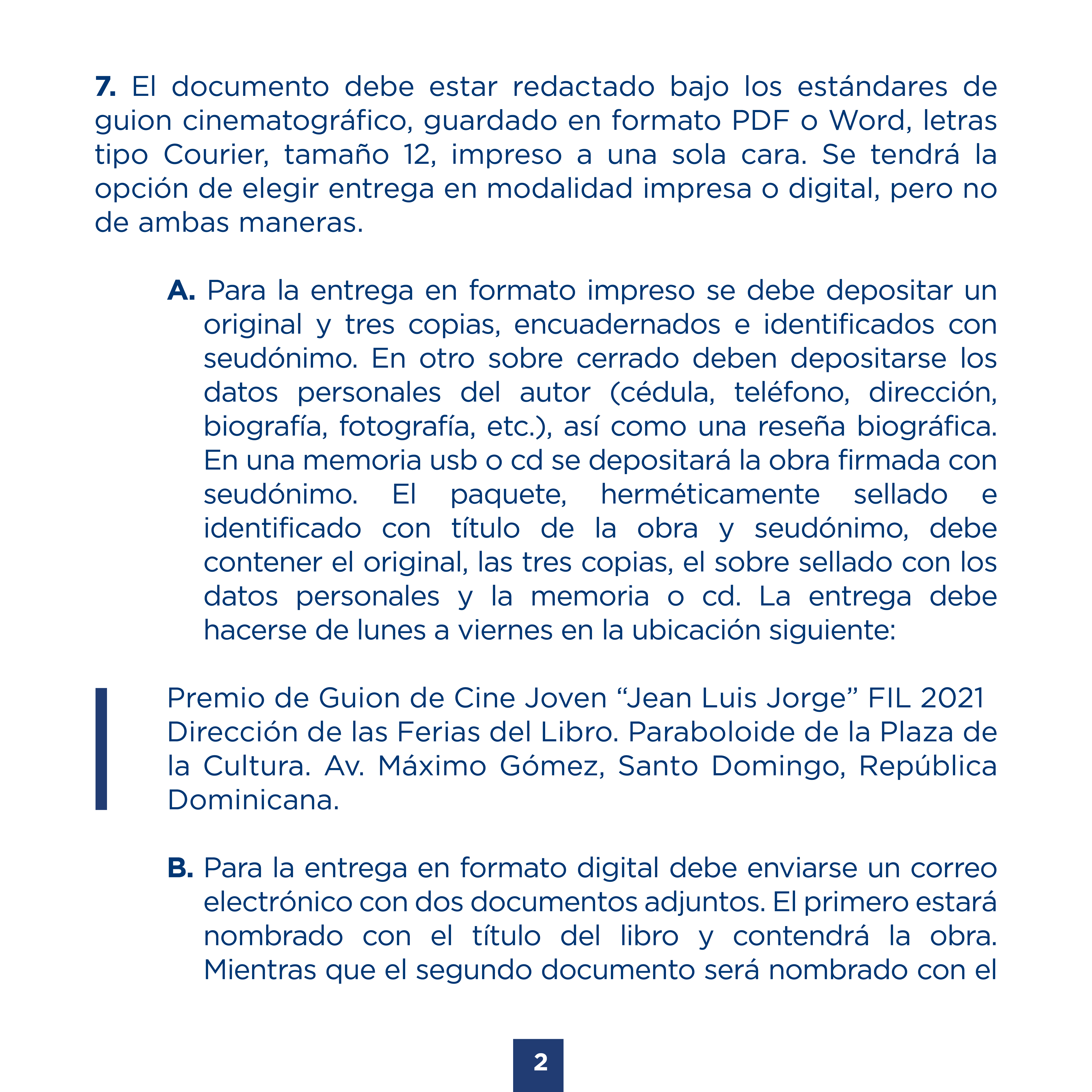 B. Para la entrega en formato digital debe enviarse un correo electrónico con dos documentos adjuntos. El primero estará nombrado con el título del libro y contendrá la obra. Mientras que el segundo documento será nombrado con el seudónimo y contendrá los datos (nombre, cédula, breve reseña biográfica, fotografía, etc.). Se enviará al correo Esta dirección de correo electrónico está siendo protegida contra los robots de spam. Necesita tener JavaScript habilitado para poder verlo. con el asunto: Premio de Guion de Cine Joven “Jean Luis Jorge” FIL 2021
