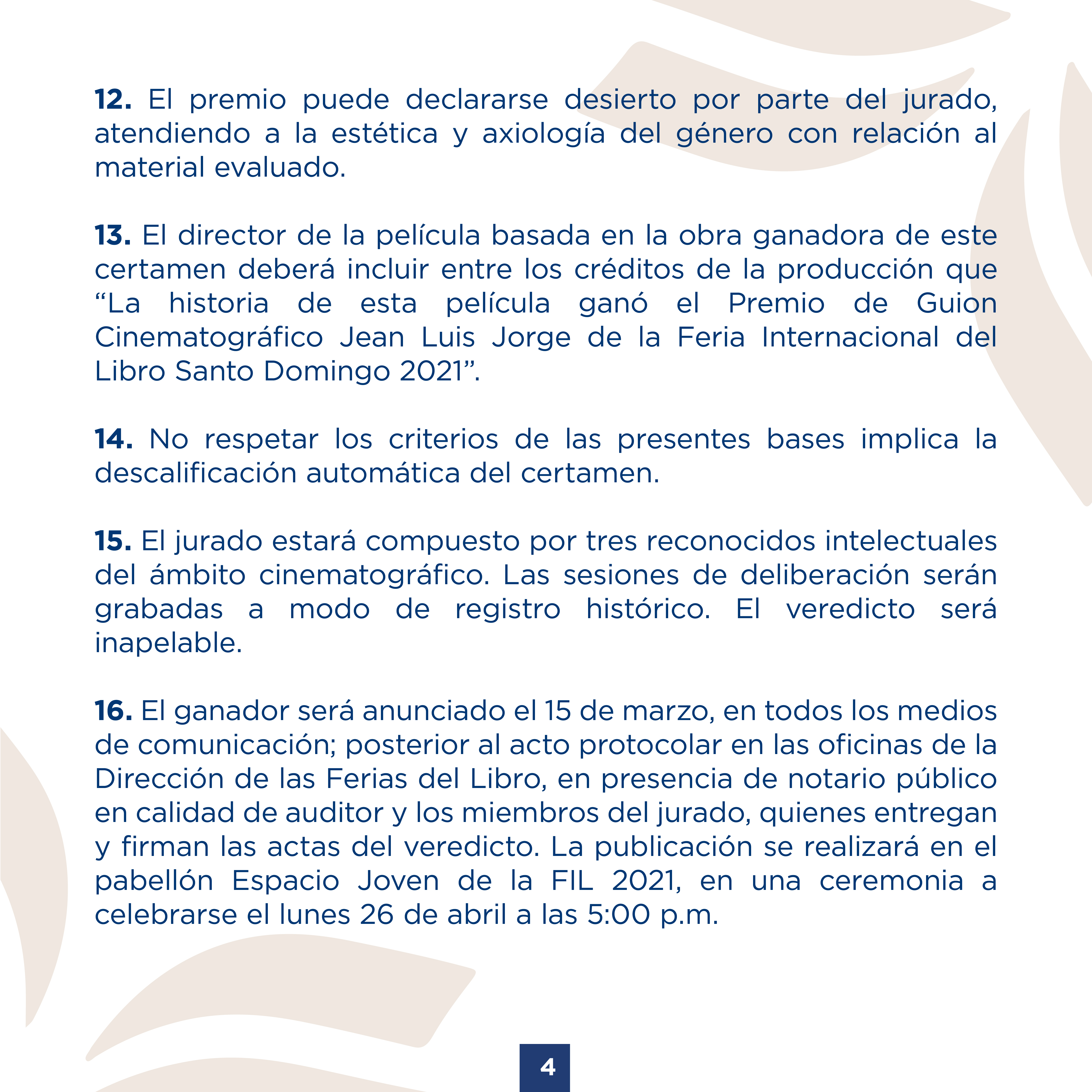 El director de la película basada en la obra ganadora de este certamen deberá incluir entre los créditos de la producción que “La historia de esta película ganó el Premio de Guion Cinematográfico Jean Luis Jorge de la Feria Internacional del Libro Santo Domingo 2021”.