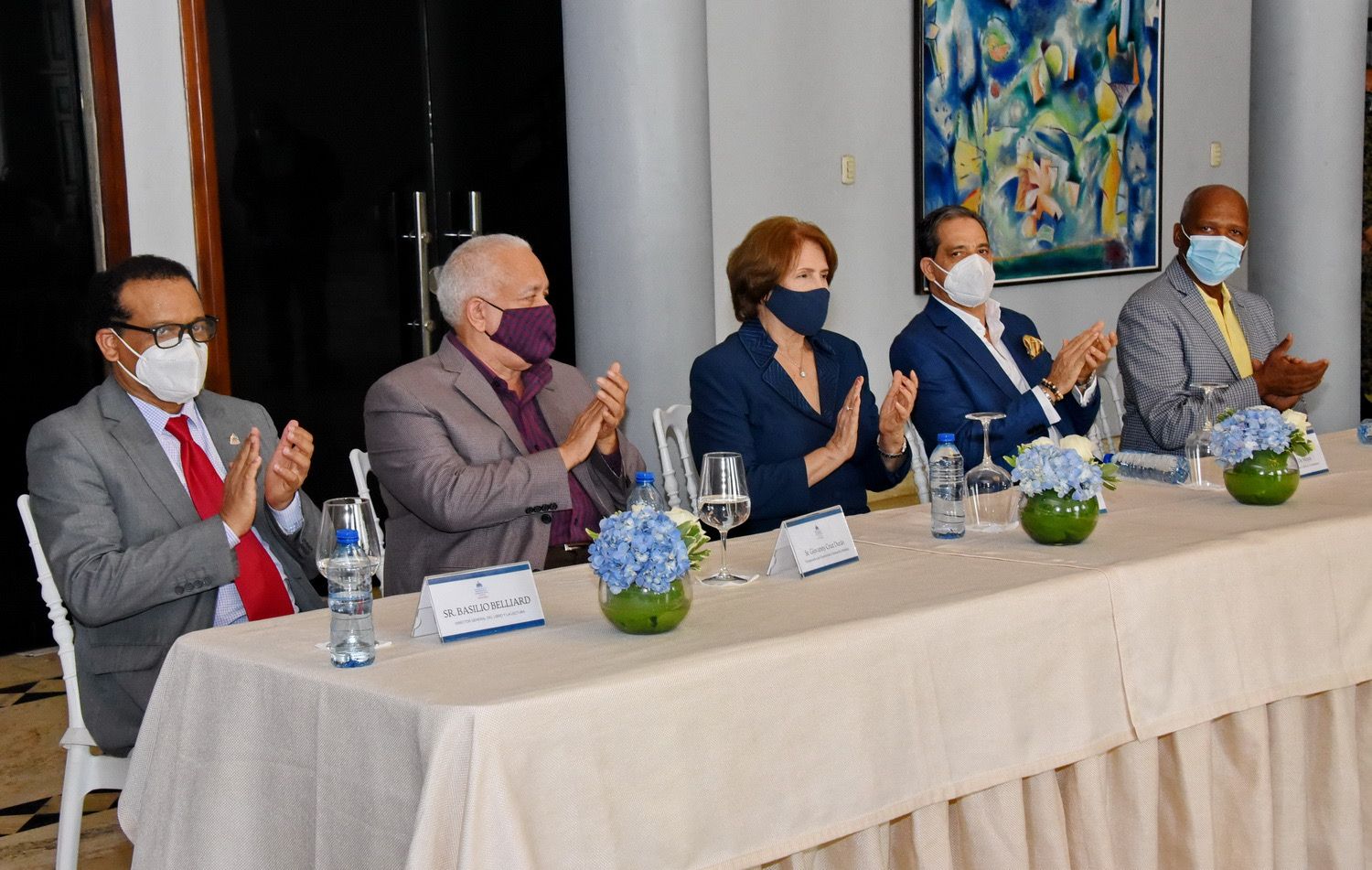 La mesa principal estuvo integrada por Carmen Heredia, ministra de Cultura; Pastor de Moya, viceministro de Identidad Cultural y Ciudadanía; Giovanny Cruz, viceministro de Creatividad y Formación Artística; Basilio Belliard, director general del Libro y la Lectura, y César Augusto Zapata, director de Gestión Literaria.