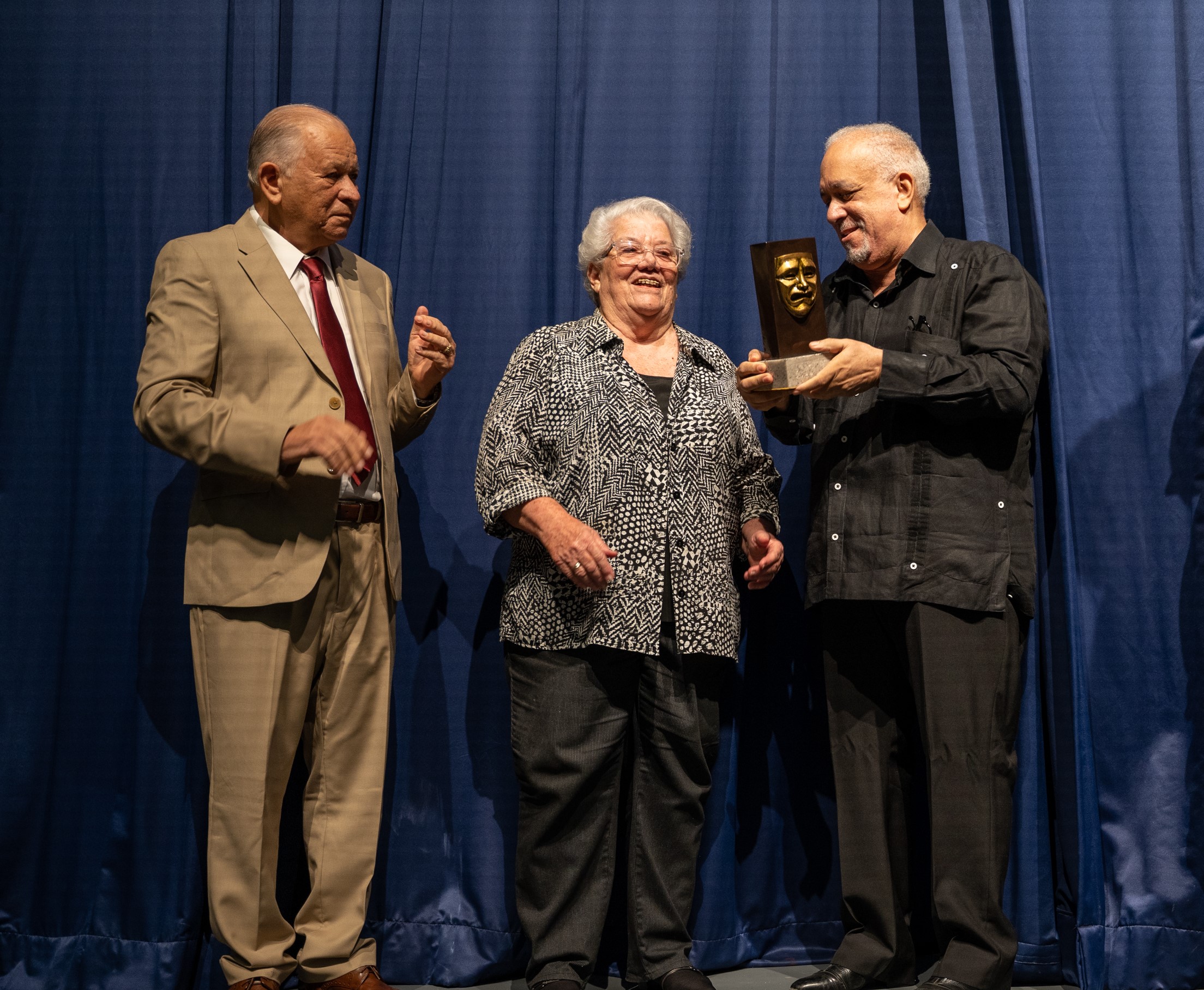 El viceministro Giovanny Cruz y Víctor Vidal aprovecharon la ocasión para entregar un reconocimiento a esta destacada teatrista por los aportes realizados durante toda una vida dedicada al teatro dominicano.