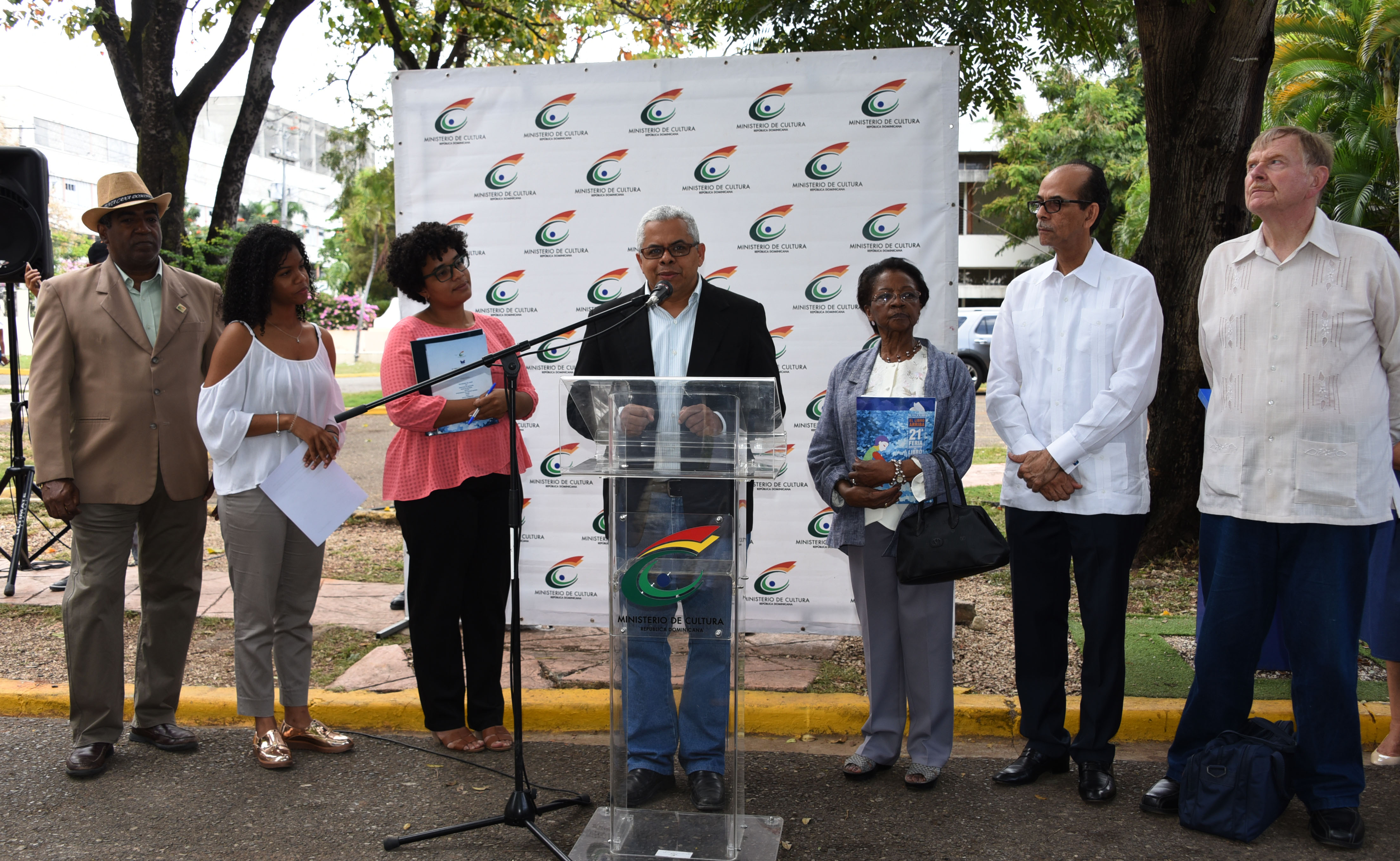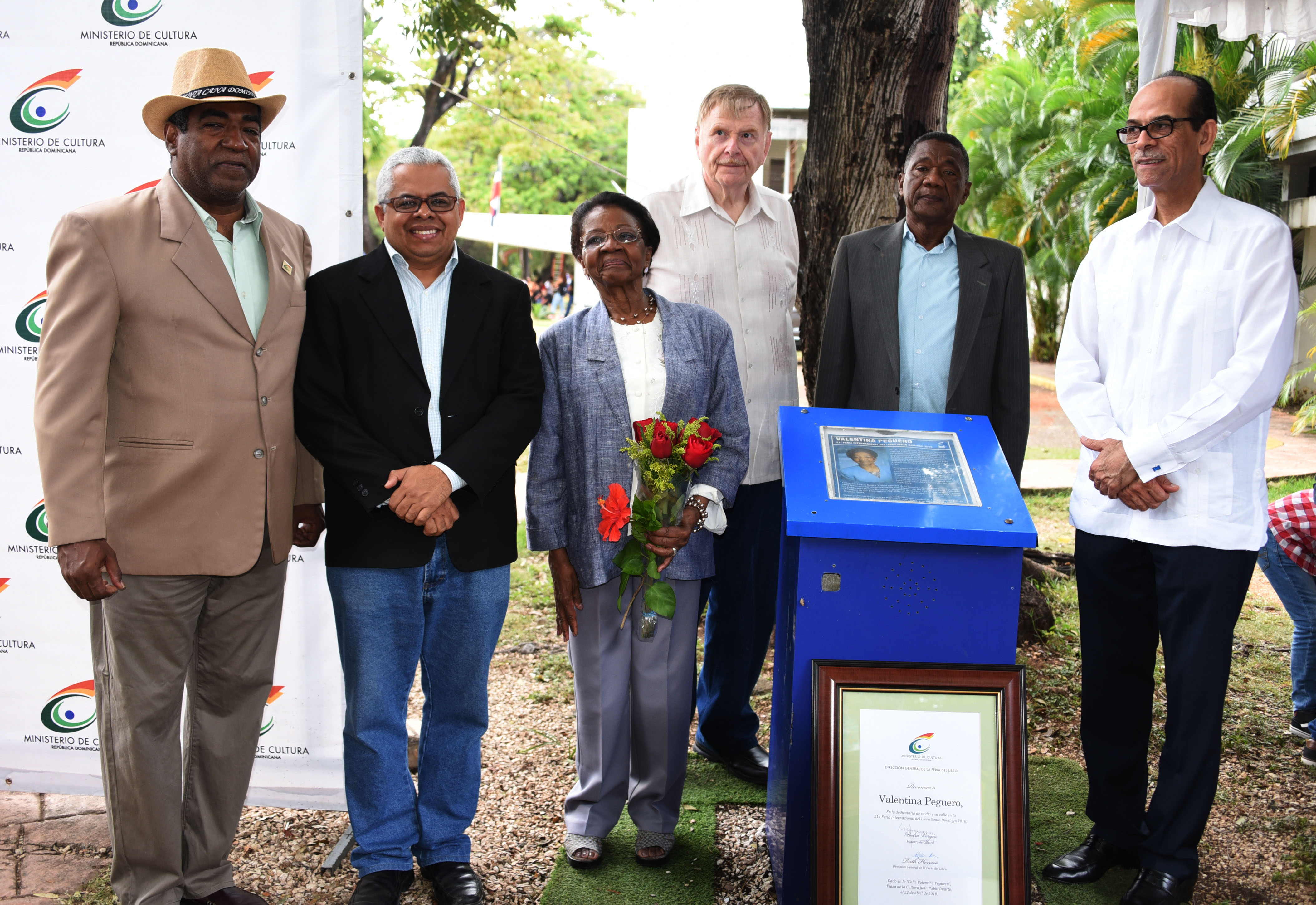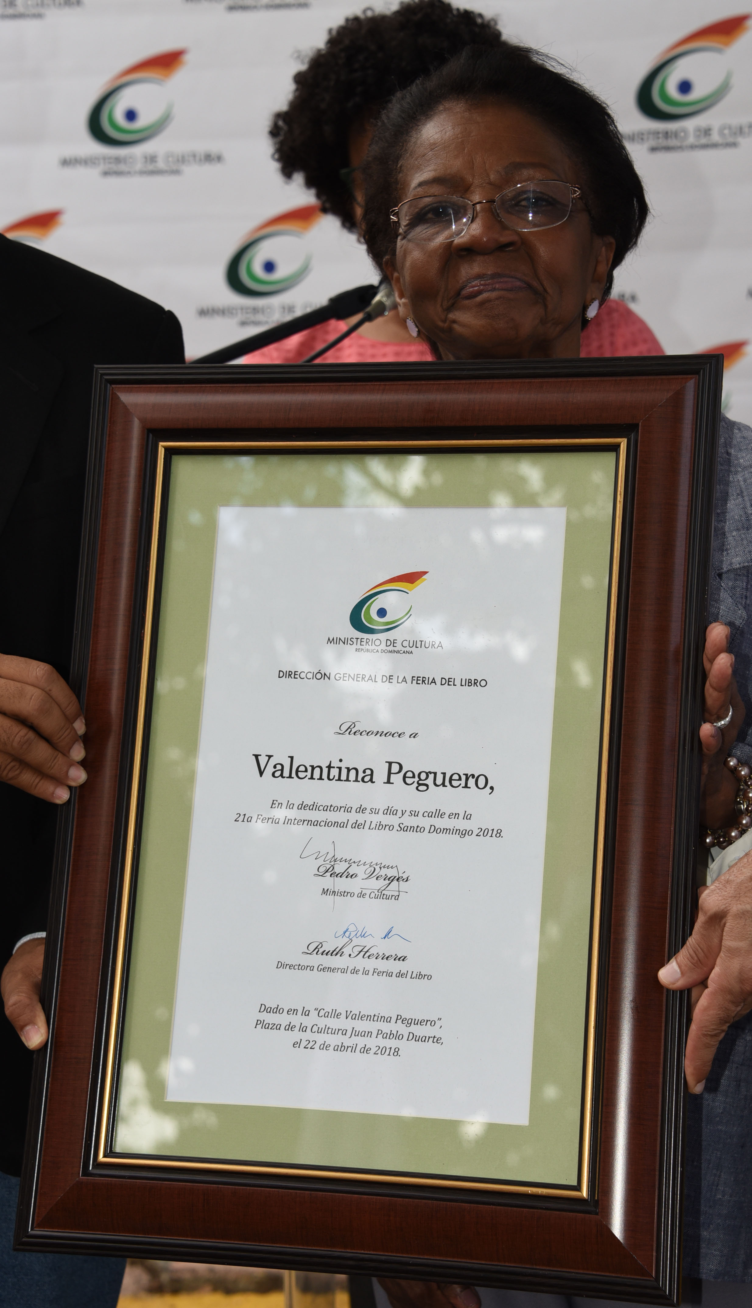 La escrito y maestra Valentina Peguero recibió el pergamino de la mano del viceministro de Cultura, Carlos Santos, en representación del ministro de Cultura, Pedro Vergés, en compañía de Valentín Amaro, miembro del consejo ejecutivo de la Feria Internacional del Libro. Familiares, amigos y allegados también se dieron cita al recinto ferial para ser parte de este reconocimiento.