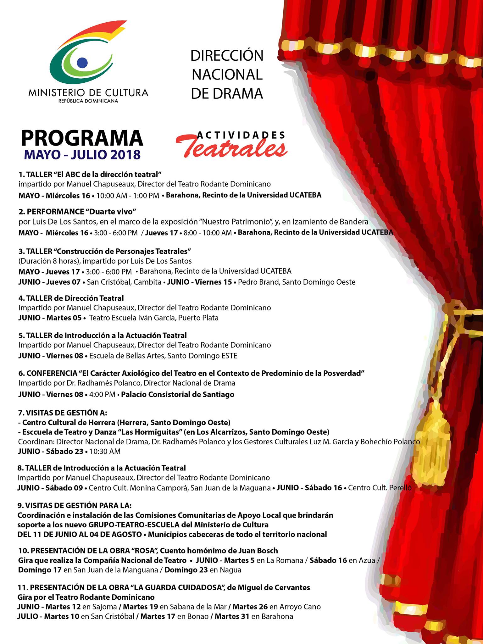 La Dirección Nacional de Drama del Ministerio de Cultura, desarrolla, desde el pasado mes de mayo, un amplio programa de actividades, cuyo objetivo principal es la proyección y fomento del quehacer teatral en distintos puntos del territorio nacional.