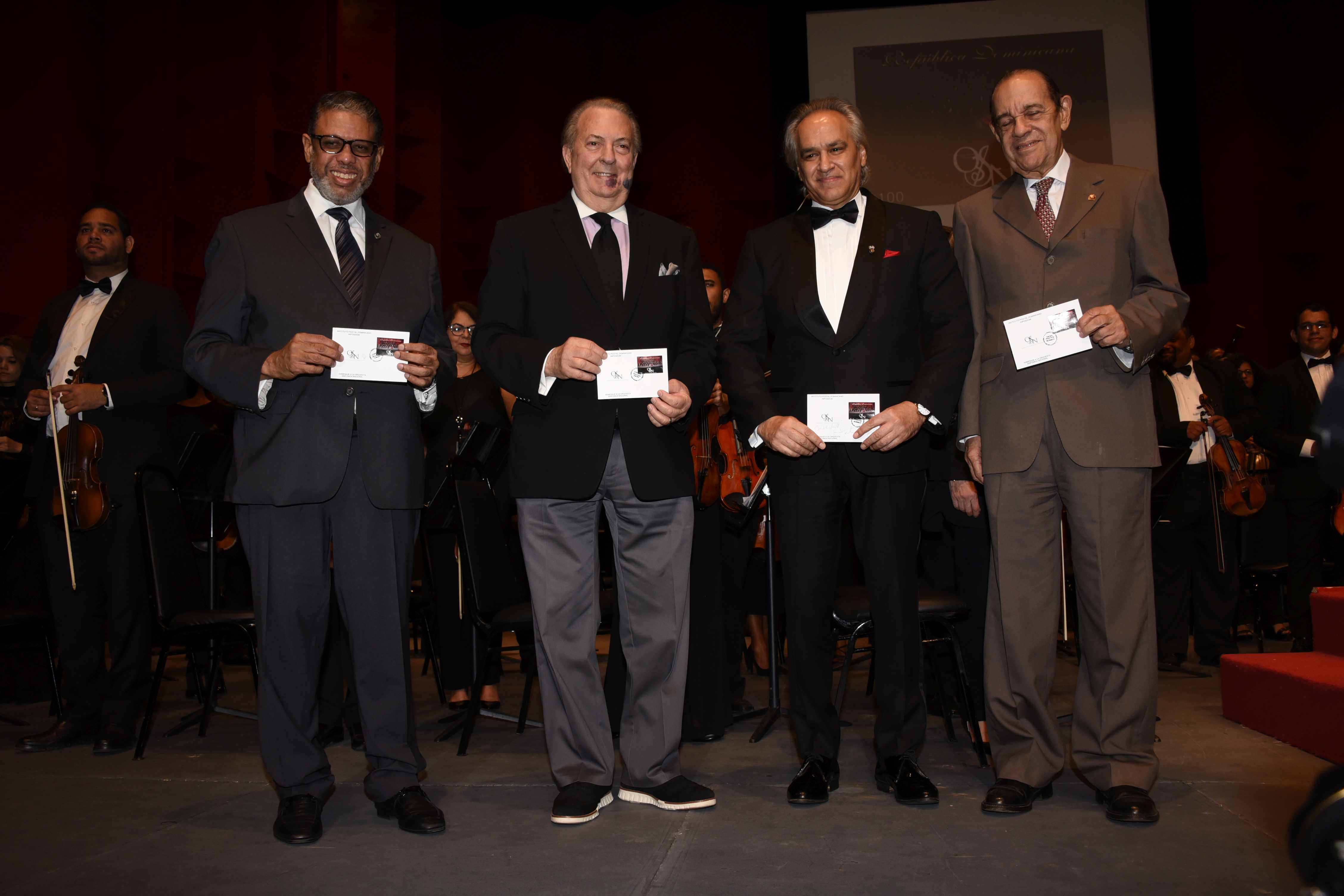 La actividad celebrada en el Teatro Nacional Eduardo Brito estuvo encabezada por el ministro de Cultura, arquitecto Eduardo Selman, y el director del Instituto Postal Dominicano, Modesto Guzmán, la que incluyó un concierto, dirigido por el titular de la Orquesta Sinfónica Nacional, el maestro José Antonio Molina, y de Santy Rodríguez, director asistente.