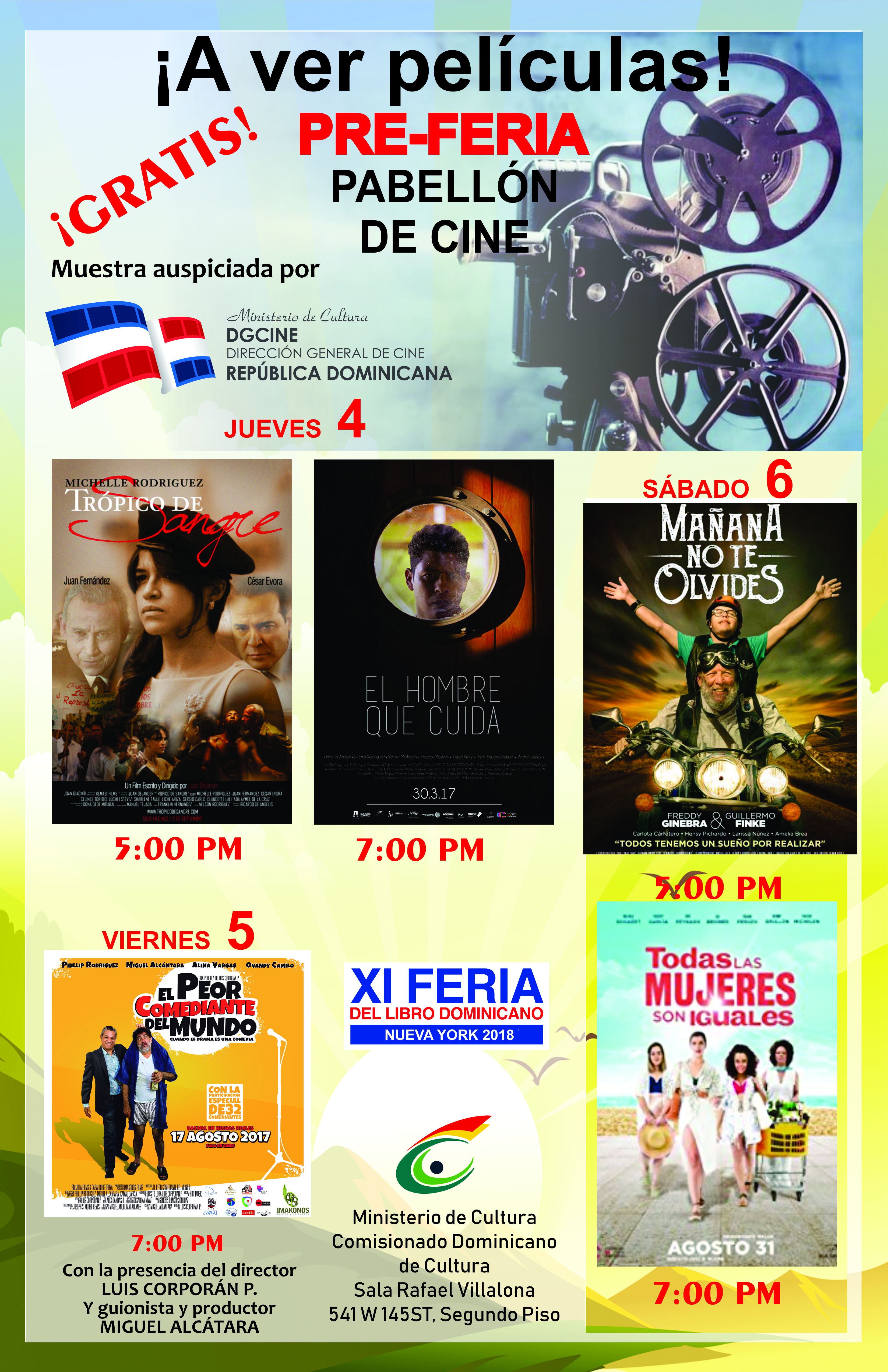 El comisionado de Cultura, Lic. Carlos Sánchez, y Peddy García, directora del Departamento de Cine del Comisionado, invitaron a los amantes del cine a ver estas cinco películas dominicanas completamente gratis, que se estarán presentando en la Sala de Teatro Rafael Villalona del Comisionado Dominicano de Cultura en los Estados Unidos, localizada en el 541 West de la calle 145, en Manhattan, Nueva York.