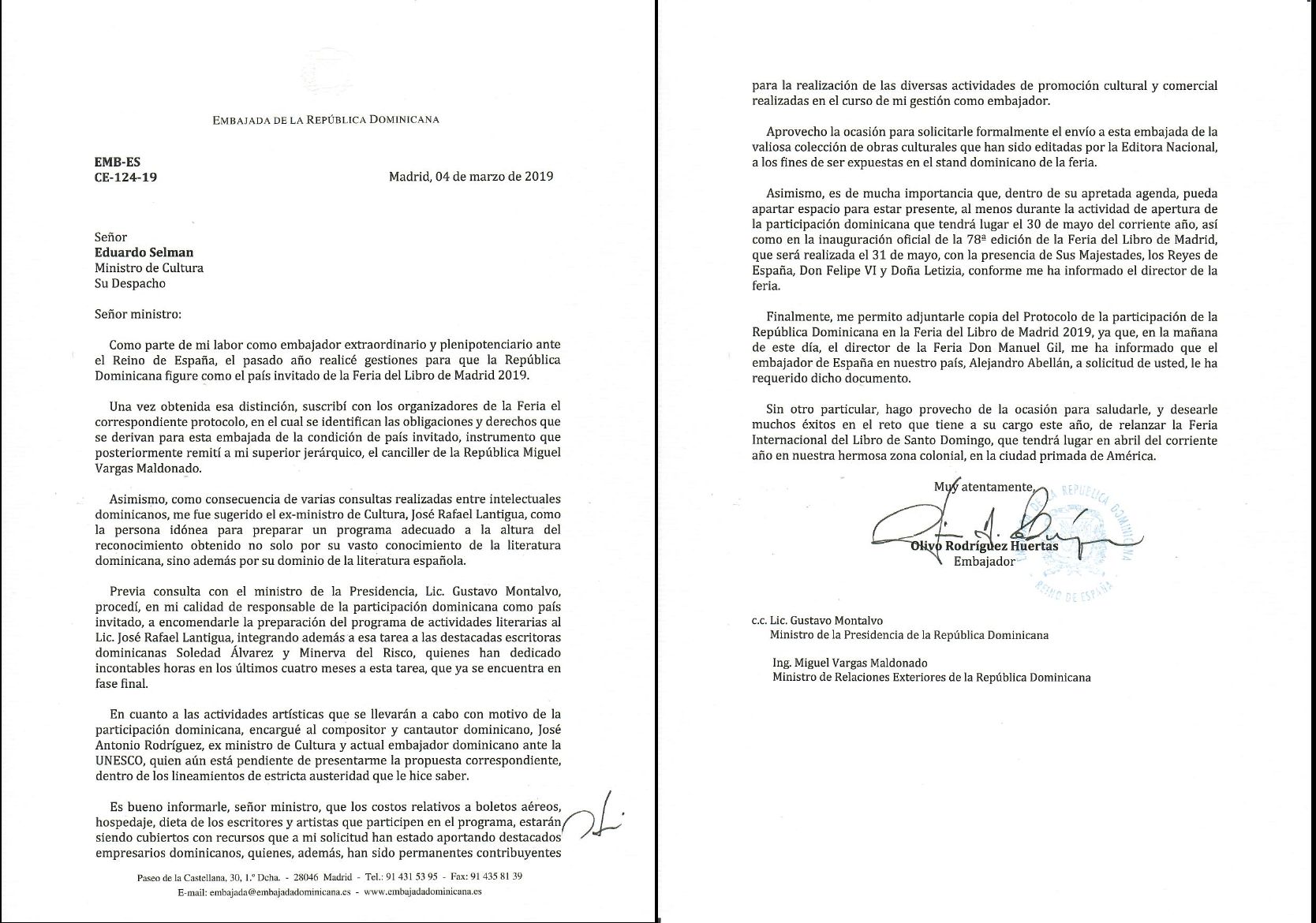 Agrega que el documento fue enviado por el embajador Rodríguez Huertas luego de que el ministro Selman se dirigiera al embajador de España, Alejandro Abellán García, requiriéndole el protocolo de la participación de República Dominicana en la Feria del Libro de Madrid que organiza la Asociación de Empresas y Empresarios del Comercio del Libro de esa ciudad, ya que no había recibido información alguna iniciado el mes de marzo del presente año y la que venía solicitando al embajador dominicano en España desde mayo del 2018.