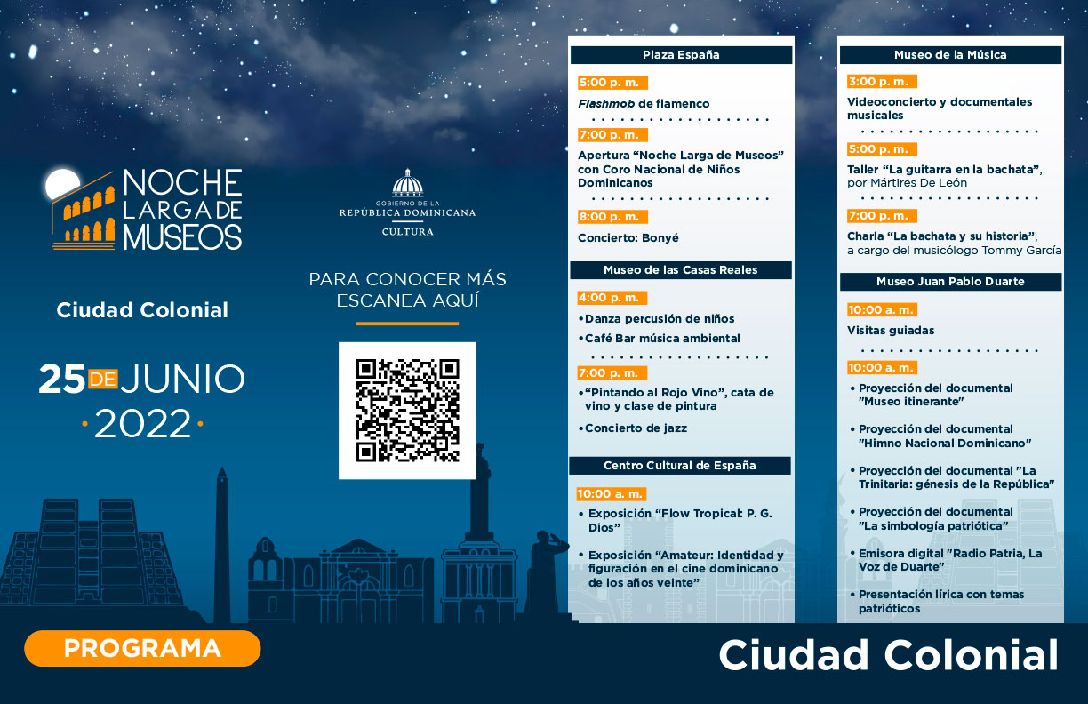 El Ministerio de Cultura y la Dirección General de Museos celebran la "Noche Larga de los Museos 2022", el evento anual más esperado por la población dominicana, que incorpora en esta ocasión al Gran Santo Domingo y 5 provincias del país.