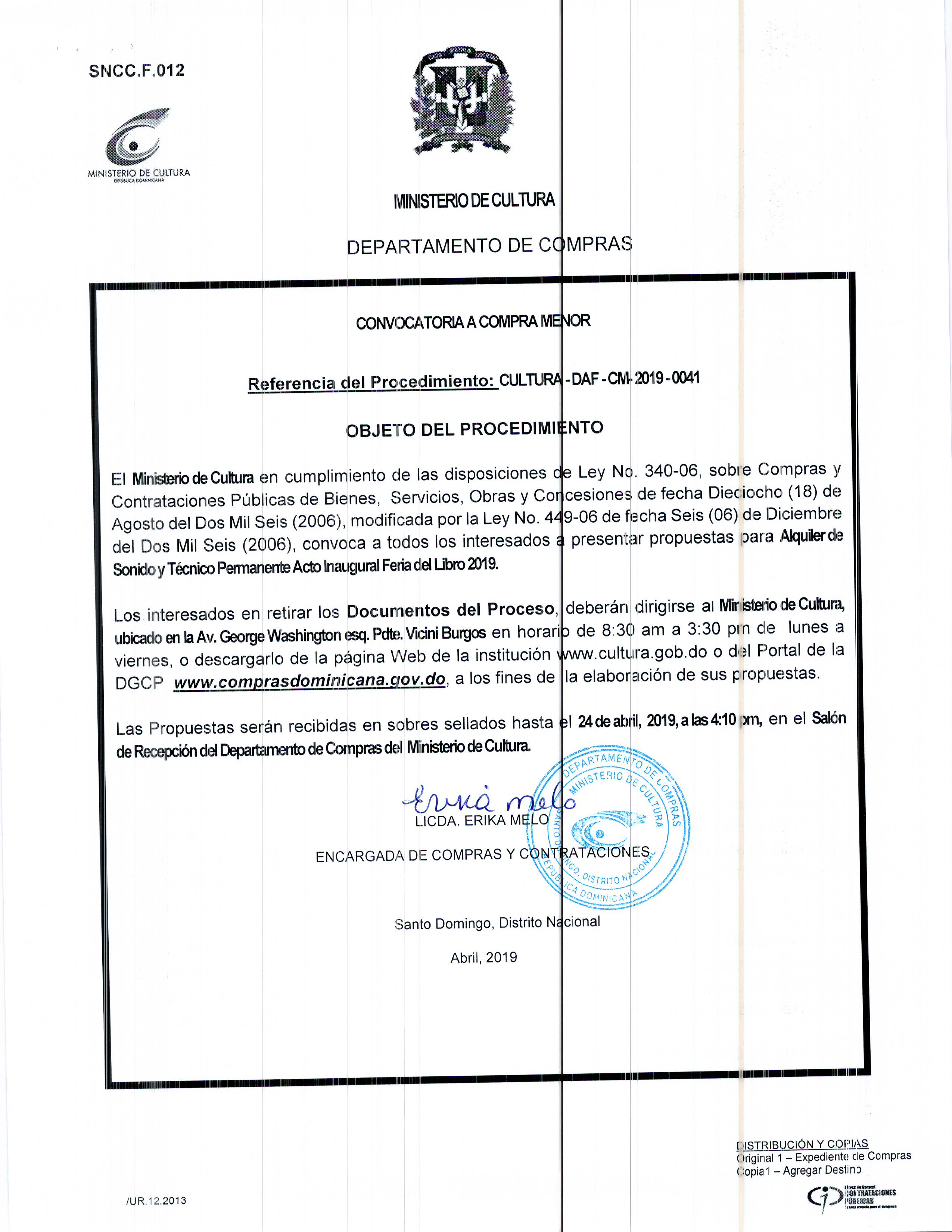 CULTURA-DAF-CM-2019-0041 Convocatoria a compra menor para: Alquiler de Sonido y Técnico Permanente Acto Inaugural Feria del Libro 2019