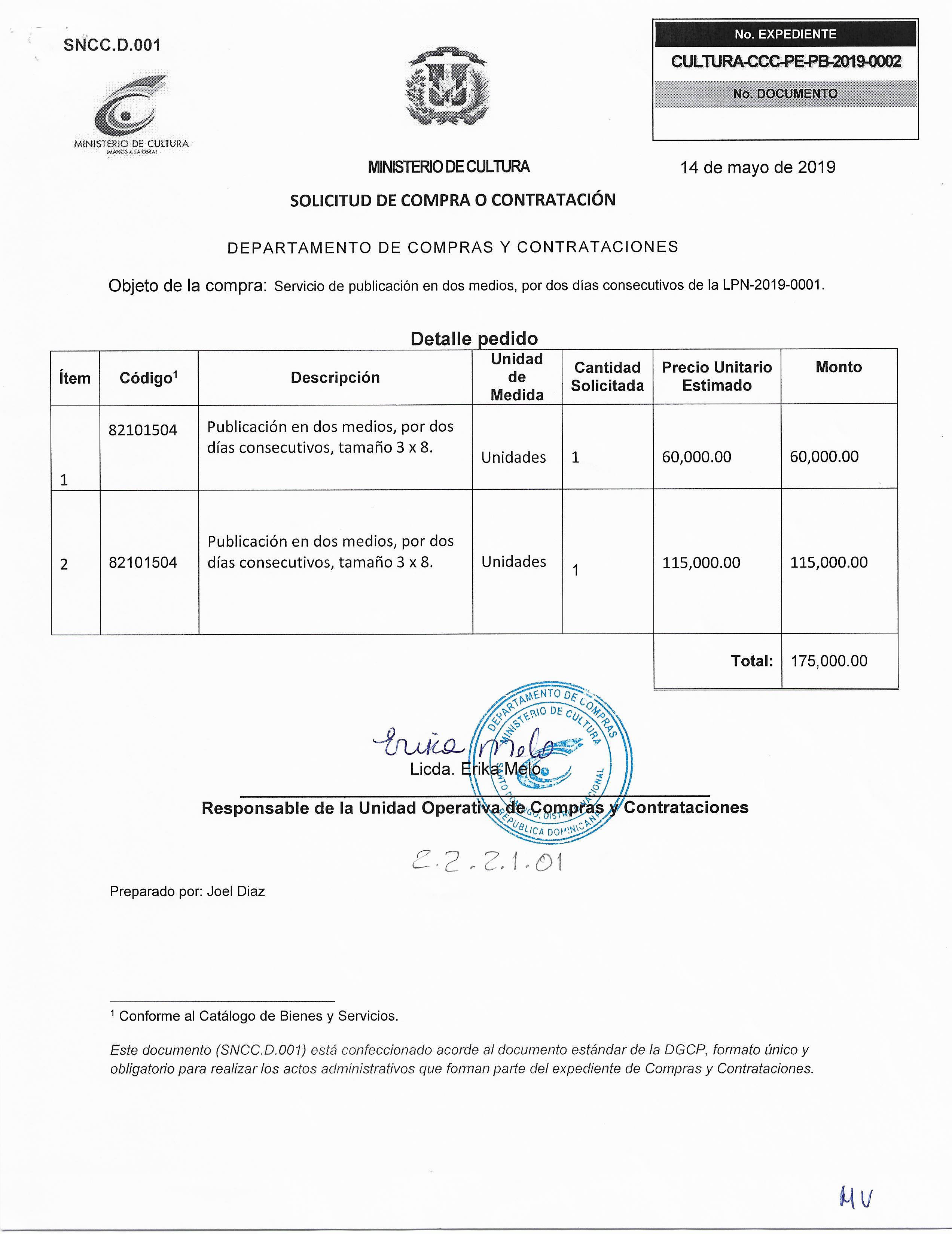 CULTURA-CCC-PEPB-2019-0002: servicios de publicacion en dos medios, por dos días consecutivos de la LPN-2019-0001